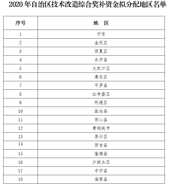 根据《自治区党委 人民政府关于推进创新驱动战略的实施意见》(宁党发〔2017〕26号)和《宁夏回族自治区技术改造综合奖补资金管理办法(暂行)》(宁财规发〔2018〕12号)有关要求,自治区工信厅、财政厅联合组织开展了2020年工业企业技术改造综合奖补资金申报工作。经各地申报、综合考评、会议审定等程序,初步提出2020年自治区技术改造综合奖补资金拟分配地区名单(见附件),现予公示。公示期自2020年6月10日至6月16日,时间为5个工作日。